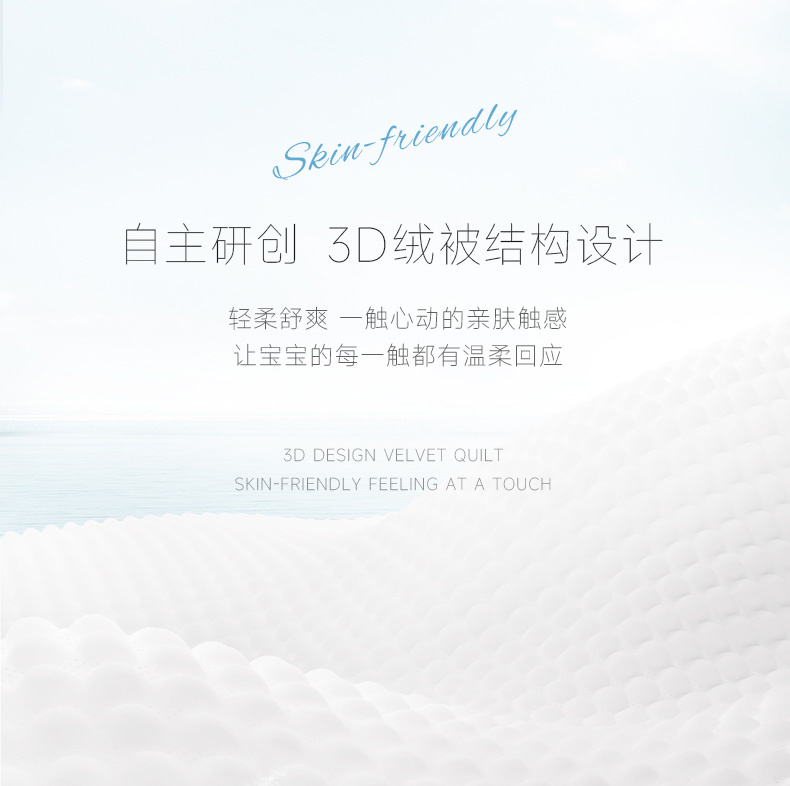 【3D絨被結構科技】自主研創親膚面層,輕柔舒爽,還原絨被般令人一觸心動的親膚觸感。